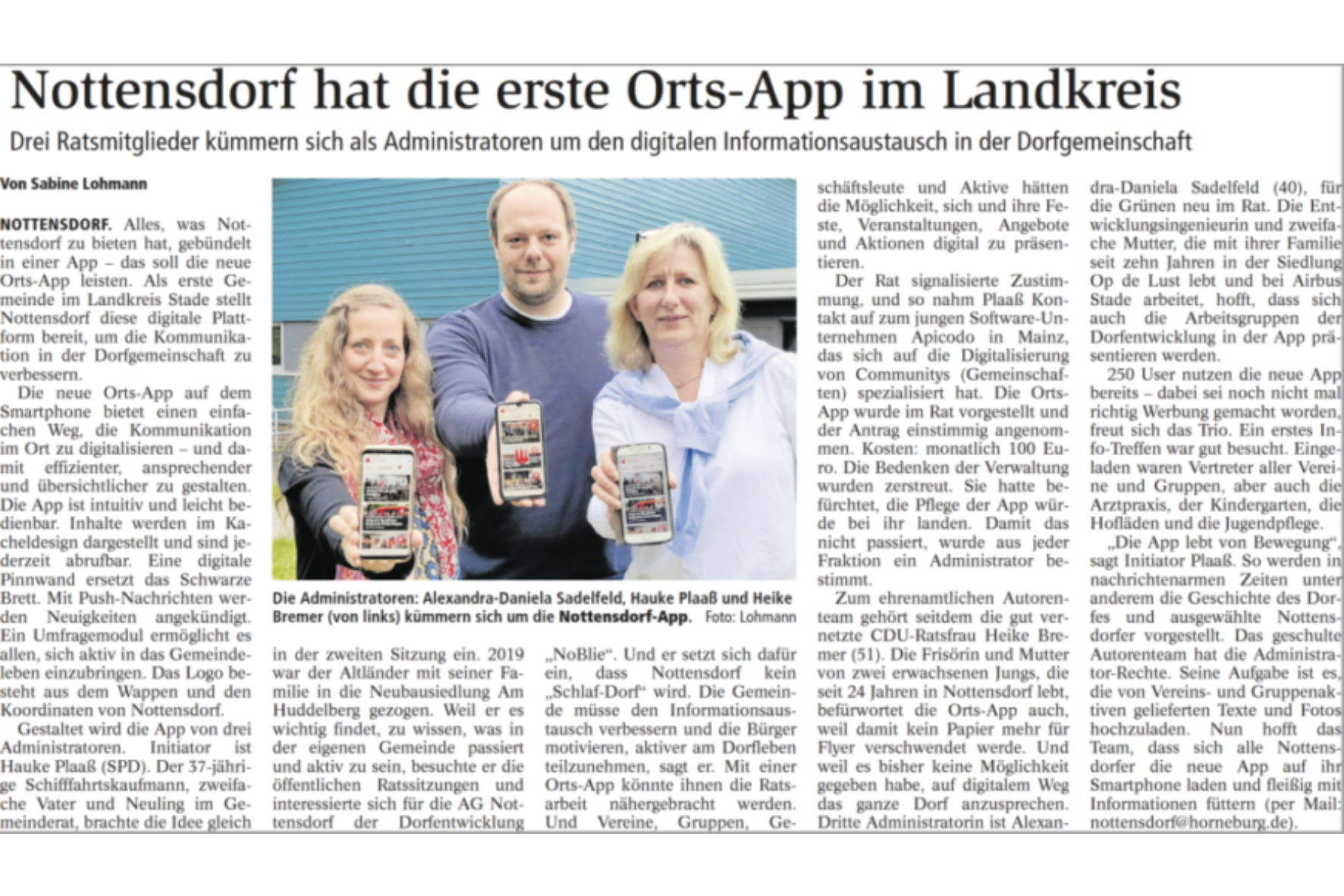 Alles, was Nottensdorf zu bieten hat, gebündelt in einer App – das soll die neue Orts-App leisten. Als erste Gemeinde im Landkreis stellt Nottensdorf eine App bereit, um die Kommunikation in der Dorfgemeinschaft zu verbessern. Den gesamten Artikel online nachlesen können Sie auf der Website über diesen Link.
